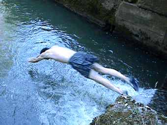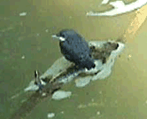After having celebrated trout's return (and left aside marching ants and a colorful selection of insects in all sizes (matching from Roemer's fingernail to your average matchbox), which up till now I only knew fromand honestly rather seebehind glass in the zoo), this morning when I opened the bathroom shutters just before 6am, at 30 feet away from the open window (the windows open inwards, the shutters outwards) a small (young?) owl stared me in the face from the opposite pine, for a few seconds, then took off over the island. Later I OBSed a young dipper on a piece of driftwood in the pond, where it let itself be studied even from the shore from where the pic was taken. When we returned home this afternoon around 4pm Gilberthe discovered a 5ft. snake (dark green back, yellowish-green belly) next to the chicken run. I ran for my Mavica while she witnessed it enter the chicks' club, where it hang out for a few minutes before slowly leaving under the grass, probably for the river. It wasn't a viper, could it be a blindworm? This length? This colour?